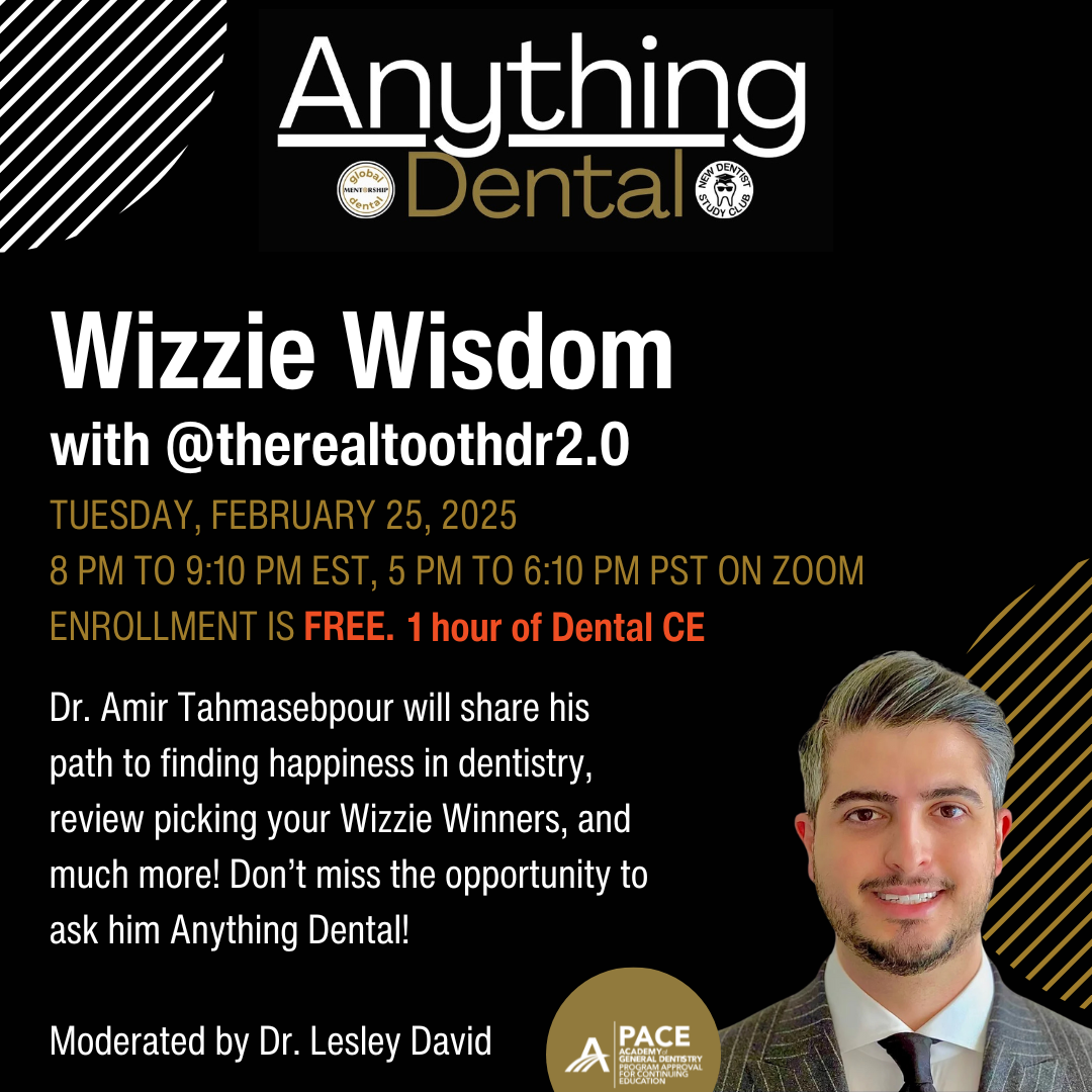 Join us for our Webinar on Wizzie Wisdom with Dr. Amir Tahmasebpour AKA @therealtoothdr2.0. As a general dentist who has a passion for wisdom teeth, he will share his path to finding happiness in dentistry, review picking your Wizzie Winners, and much more! Don’t miss the opportunity to ask Anything Dental to Dr. Amir Tahmasebpour. The live stream will be moderated by Dr. Lesley David.